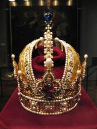 Keywords: Weltliche Schatzkammer Wien (6).JPG Die Krone Kaiser Rudolfs II ; später Krone des Kaisertums Österreich Jan Vermeyen gest 1606 Prag Prag 1602 Gold teilweise emailliert Edelsteine Perlen Samt H 28 3 cm Kronreif 22 4 cm Durchmesser mit Perlen größte Spannweite über Stirn- und Nackenlilien 27 8 cm SK Inv -Nr XIa 1 The Crown of Rudolf II later Crown of the Austrian Empire Jan Vermeyen Prague 1602 Gold partially enamelled diamonds rubies spinel rubies sapphire pearls velvet H 28 3 cm circlet 22 4 cm in diameter with pearls largest span over the fleurs-de-lis on the brow and neck 27 8 cm SK Inv No XIa 1 Own 2007-10 MyName Gryffindor Imperial Crown of Austria Secular and Ecclesiastical Treasury |