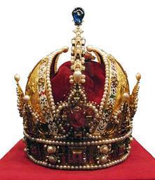 Keywords: Weltliche Schatzkammer Wien white.jpg Die Krone Kaiser Rudolfs II ; später Krone des Kaisertums Österreich Jan Vermeyen gest 1606 Prag Prag 1602 Gold teilweise emailliert Edelsteine Perlen Samt H 28 3 cm Kronreif 22 4 cm Durchmesser mit Perlen größte Spannweite über Stirn- und Nackenlilien 27 8 cm SK Inv -Nr XIa 1 The Crown of Rudolf II later Crown of the Austrian Empire Jan Vermeyen Prague 1602 Gold partially enamelled diamonds rubies spinel rubies sapphire pearls velvet H 28 3 cm circlet 22 4 cm in diameter with pearls largest span over the fleurs-de-lis on the brow and neck 27 8 cm SK Inv No XIa 1 Own 2007-10 MyName Gryffindor <gallery>Image Weltliche Schatzkammer Wien 265 JPG this picture with originally background</gallery> remove background Imperial Crown of Austria Secular and Ecclesiastical Treasury |
