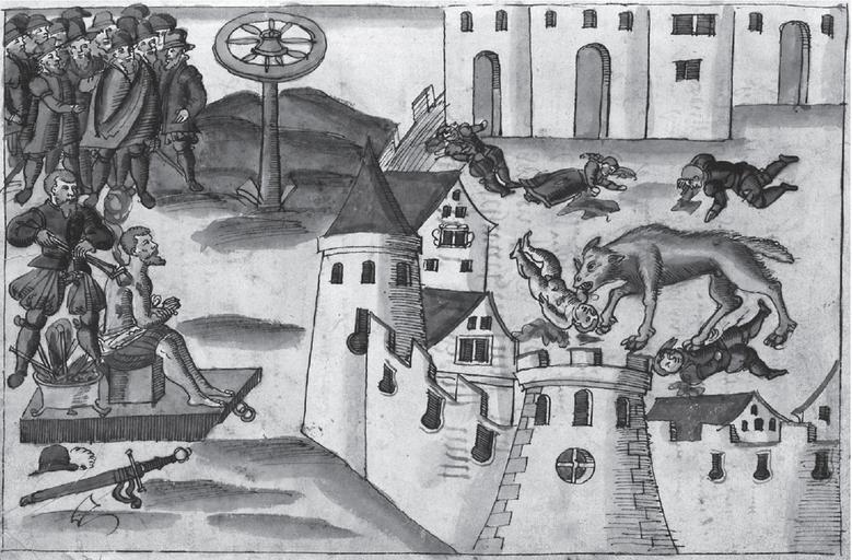 Keywords: Werewolf in Geneva (1580).png In Geneva a man killed 16 children when he had changed himself into a wolf; he was executed on 15 October 1580 Coloured pen drawing Johann Jakob Wick Sammlung von Nachrichten zur Zeitgeschichte aus den Jahren 1560 1587 ms F 29 fol 167v From the Zentral Bibliothek ZΓΌrich Π ΠΠ΅Π½Π΅Π²Π΅ ΠΌΡΠΆΡΠΈΠ½Π° ΡΠΊΠΎΠ±Ρ ΡΠ±ΠΈΠ» ΠΏΡ Π΅Π²Ρ Π°ΡΠΈΠ²ΡΠΈΡΡ Π² Π²ΠΎΠ»ΠΊΠ° 16 Π΄Π΅ΡΠ΅ΠΉ; ΠΎΠ½ Π±ΡΠ» ΠΊΠ°Π·Π½ΡΠ½ 15 ΠΎΠΊΡΡΠ±Ρ Ρ 1580 Π³ΠΎΠ΄Π° Π ΠΈΡΡΠ½ΠΎΠΊ ΠΈΠ· ΡΠ°ΠΊ Π½Π°Π·ΡΠ²Π°Π΅ΠΌΠΎΠΉ ΠΠΈΠΊΠΈΠ°Π½Ρ - ΡΠΎΠ±Ρ Π°Π½ΠΈΡ ΠΏΠ°ΡΡΠΎΡ Π° ΡΡΡ ΠΈΡ