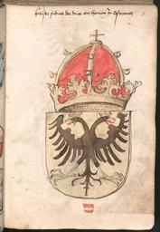 | Keywords: Wernigeroder Wappenbuch 023.jpg žWernigeroder Schaffhausensches Wappenbuch ; Süddeutschland 4 Viertel 15 Jh <br />Bayerische Staatsbibliothek München Cod icon 308 n<br /> Wappen ideeller Vorfahren und Wappen höchster weltlicher und geistlicher Würdenträger Kaiser Friedrich III Herzog von Österreich http //daten digitale-sammlungen de/~db/0004/bsb00043104/images/ circa 1475 “1500 anonymous PD-old Wernigeroder Wappenbuch Coats of arms of Frederick III Holy Roman Emperor Or shield coats of arms of Holy Roman Emperors |
