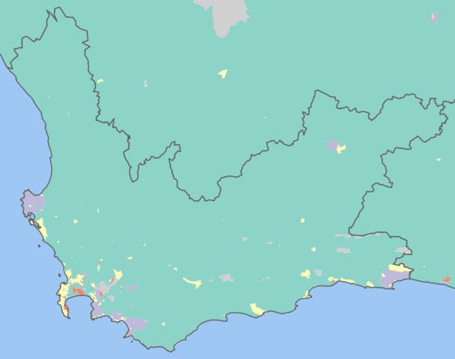 | Keywords: Western Cape 2001 dominant population group map.svg fb8072 Black African 8dd3c7 Coloured 80b1d3 Indian or Asian ffffb3 White bebada No group dominant d0d0d0 No population Projection is Albers Equal-Area Conic with standard parallels at 25 5° S and 31 5° S and origin at 28 5° S 25 5° E Statistics South Africa's Census 2001 is the source of the basic population data The map results from my own processing of the data Htonl 2010-02-07 Htonl The following license applies to the population data on which the map is based http //www statssa gov za/copyrightdisclaimer asp the user acknowledges Stats SA as the source of the basic data wherever they process apply utilise publish or distribute the data and also that they specify that the relevant application and analysis where applicable result from their own processing of the data The following tag applies to the map itself Demographic maps of South Africa Maps of the Western Cape |