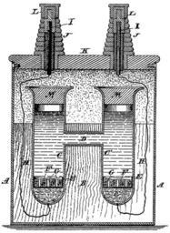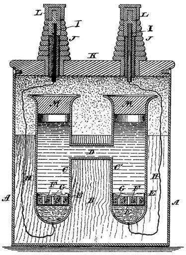 Keywords: Westoncell Volt.png en Extracted from PDF revealing US patent 494 827 A Outer shell or casing made preferably of sheet brass elliptical in form B Wooden block containing cavities or recesses to receive the glass cells C C' C C' Glass cells consist of two cylindrical vessels connected by a transverse tube D E Piece of muslin or other suitable cloth F Cork pierced with apertures G H Connecting wires I Copper wires connected to H J Suitable binding posts provided with covering caps L K Cover of the shell A which is made of rubber M Suitable stoppers inserted in the mouths of the cell 2012-03-27 www google com/patents/US494827 pdf Edward Weston died 20-Aug-1936 <gallery showfilename> File Westoncell Volt jpg </gallery> PD-old Uploaded with UploadWizard Edward Weston chemist History of electric batteries |
