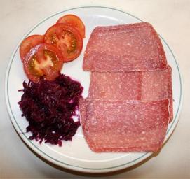 | Keywords: Westphalean-Salami-meal.jpg Odd variations of salami include this Westphalian salami made with pork and French Camembert I like it served with sliced tomato and sweet-pickled red cabbage 2007-02-15 own assumed J P Lon~commonswiki Salami Tomato slices Red cabbage-based food Grated food Cold cuts in Germany |