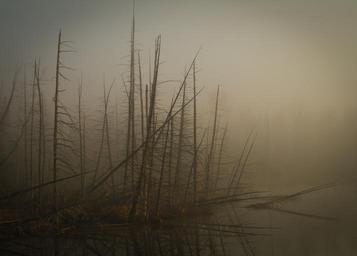 Keywords: wetland mist trees dead trees swamp fog early morning