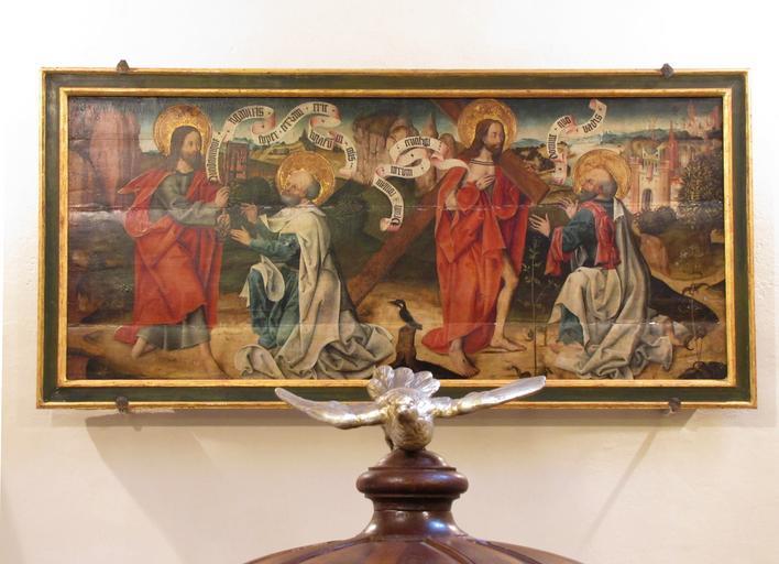 | Keywords: Weyersheim StMichel 41.JPG  fr Alsace Bas-Rhin Weyersheim Eglise St Michel 1784 Tableau Rencontres du Christ avec St Pierre et St Paul XVe-XVIe own 2012 Ralph Hammann cc-by-sa-3 0 Artwork / Œuvre d'art / Kunstwerk Artist XVe-XVIe siècle oil wood cm 77 175 Eglise St Michel Weyersheim IM67007109 PM67000446 object history La facture du tableau et la ressemblance de saint Pierre avec celui du maître-autel de la cathédrale de Fribourg-en-Brisgau peint vers 1512-1515 par Hans Baldung Grien permet d'attribuer ce tableau à l'entourage de ce maître ; le tableau devrait être restauré afin de supprimer le blocage du parquetage other versions Ralph Hammann PD-old accession number Photographs of Weyersheim by Ralph Hammann Taken with Canon PowerShot SX20 IS Interior of Église Saint-Michel de Weyersheim Objets monuments historiques in Weyersheim Sculptures of the Holy Spirit as a dove in France Gothic paintings in Alsace Gothic paintings of Christ Paintings of Saint Peter in France Paintings of Saint Paul 15th-century church paintings in Alsace 15th-century paintings from Germany 16th-century church paintings in Alsace 16th-century paintings from Germany Objets monuments historiques in Bas-Rhin church paintings  |