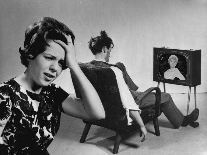 Keywords: turners (photography) ltd turnersphotographyltd advertising marriage photography cameras 1960s humour television social heritage socialheritage black and white photograph blackandwhitephotograph screen tv messy hair messyhair floral chair arm rest arm rest armrest shadow floor wood varnish scratch crease trousers shoe sock shirt waist coat waistcoat neglected wife neglectedwife woman staring gape dress face eye nose mouth lip teeth hair fabric cloth unusual interesting engaging ring skin hand finger leg feet chest back curl turners collection turnerscollection photographic negatives photographicnegatives twentieth century twentiethcentury turners saved my marriage turnerssavedmymarriage promotion business worried turners shop window turnersshopwindow inspiration restored matrimonial harmony matrimonialharmony story telling storytelling daily life dailylife funny laughter communication neutral neutral background neutralbackground story teller storyteller blackandwhite monochrome indoor black and white A neglected wife despairs as her husband stares at the television screen (TWAM ref. DT.TUR/2/28785). You can read a blog relating to these images here www.twmuseums.org.uk/engage/blog/turners-saved-my-marriage/. Tyne & Wear Archives is very fortunate to hold the photographic negatives of the firm Turners (Photography) Ltd. The collection contains many remarkable images commissioned by local firms during the second half of the Twentieth Century. The Turners collection also includes images taken by the firm to promote their own business and this set shows a short series of images taken in March 1962 to promote the sale of cameras in their shops. They tell the story of a bored husband, his mind numbed by television, and his worried wife. Looking for inspiration, the man passes by a Turners shop window and discovers the wonder of photography. At once his happiness returns and matrimonial harmony is restored. We’ve no record of the captions used by Turners to accompany these images so we’ve used a bit of artistic licence and created our own. Maybe you can suggest alternatives. (Copyright) We're happy for you to share these digital images within the spirit of The Commons. Please cite 'Tyne & Wear Archives & Museums' when reusing. Certain restrictions on high quality reproductions and commercial use of the original physical version apply though; if you're unsure please email archives@twmuseums.org.uk A neglected wife despairs as her husband stares at the television screen (TWAM ref. DT.TUR/2/28785). You can read a blog relating to these images here www.twmuseums.org.uk/engage/blog/turners-saved-my-marriage/. Tyne & Wear Archives is very fortunate to hold the photographic negatives of the firm Turners (Photography) Ltd. The collection contains many remarkable images commissioned by local firms during the second half of the Twentieth Century. The Turners collection also includes images taken by the firm to promote their own business and this set shows a short series of images taken in March 1962 to promote the sale of cameras in their shops. They tell the story of a bored husband, his mind numbed by television, and his worried wife. Looking for inspiration, the man passes by a Turners shop window and discovers the wonder of photography. At once his happiness returns and matrimonial harmony is restored. We’ve no record of the captions used by Turners to accompany these images so we’ve used a bit of artistic licence and created our own. Maybe you can suggest alternatives. (Copyright) We're happy for you to share these digital images within the spirit of The Commons. Please cite 'Tyne & Wear Archives & Museums' when reusing. Certain restrictions on high quality reproductions and commercial use of the original physical version apply though; if you're unsure please email archives@twmuseums.org.uk