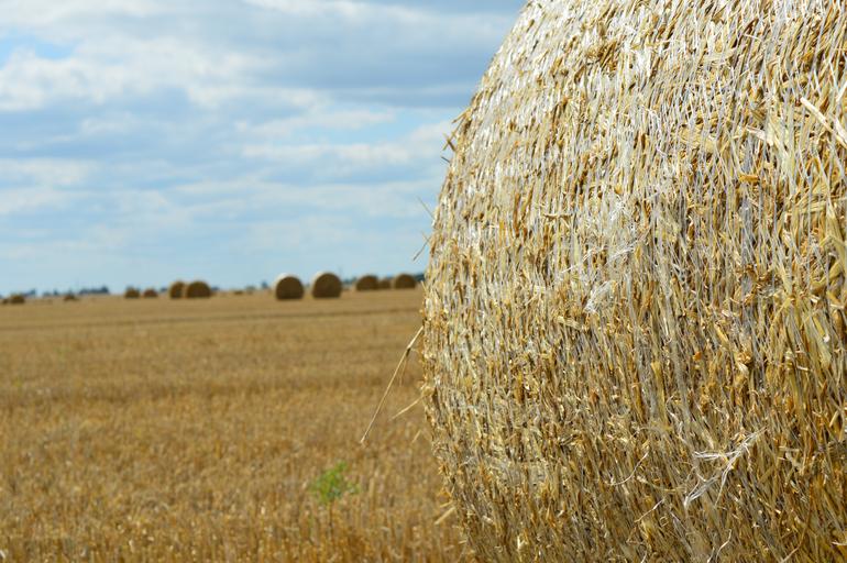 Keywords: wheat field agriculture harvesting straw bale a pile yellow farm stack sky