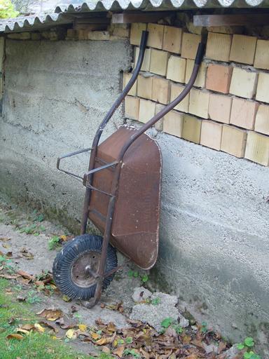 Keywords: wheelbarrow garden házfal autumn rust brick