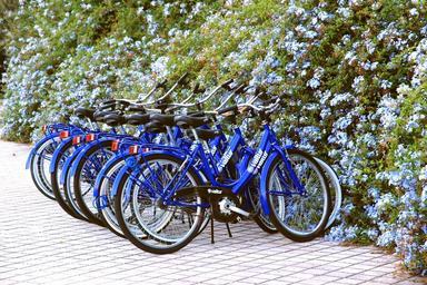 Keywords: wheels bicycles blue bicycle stand bicycle rental bike biker cycling cycle two wheeled vehicle series lined up