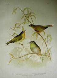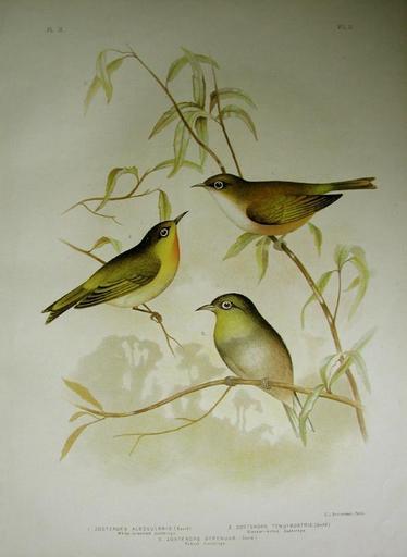 Keywords: White-eyes.jpg White-eyes 1 Zosterops Albogularis 2 Zosterops Tenuirostris 3 Zosterops Strenuus Hand-colored lithograph PL IX VOL IV by G J Broinowski from The Birds of Australia 1887-1891 http //extinct-website com/extinct-website/product_info php products_id 557 1887-1891 G J Broinowski PD-old Fauna of Lord Howe Island Birds of Australia Zosterops strenuus Zosterops albogularis Zosterops tenuirostris |