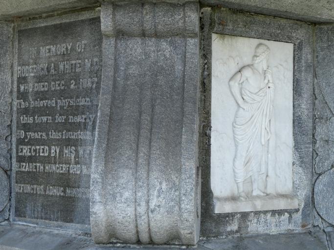 | Keywords: White Memorial Fountain relief - Weatogue, Connecticut - DSC09351.JPG en White Memorial Fountain - Weatogue village Simsbury Connecticut USA Dedicated in September 1892 in honor of Dr Roderick A White Artist s unknown; granite quarried in Monson Massachusetts by the W N Flynt Granite Company Inscription In Memory of Roderick A White M D who died Dec 2 1887 The beloved Physician of this town for nearly fifty years Erected by his wife Elizabeth Hungerford White Defunctus adhunc ministrant This artwork is in the public domain because the artist died more than 70 years ago 2013-04-21 13 16 08 own Daderot cc-zero White Memorial Fountain Uploaded with UploadWizard |