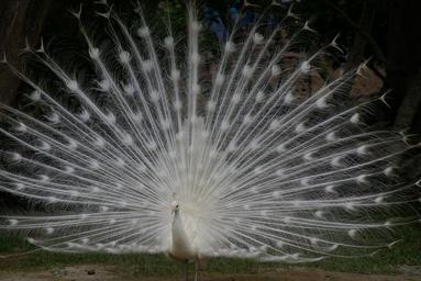 Keywords: white peacock tail spread plumage bird feather fowl elegance wild male nature beauty