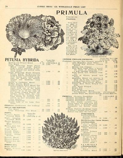 | Keywords: Wholesale price list (16374884835).jpg 24 <br> CURRIE BROS ' CO WHOLESALE PRICE LIST <br> ' l <br> PRIMULA <br> PETUNIA HYBRIDA <br> Spotted and Striped Mixed i <br> Fine Mixed <br> Large Flowering Single Finest <br> Mixed superb large flowers <br> from a clioice collection of bor- <br> dered striped and spotted sorts <br> extra choice <br> Large Flowering Single Fringed <br> Finest Mixed magnificent <br> fringed flowers unsurpassed for <br> their beauty and varied mark- <br> ings the flowers are spotted <br> striped and bordered extra <br> choice <br> Giants of California Mixed <br> Rufl ed Giants Mixed <br> Double Fringed Fancy Mixed Our <br> double-fringed Petunias are <br> saved from one of the finest <br> collections in existence and will <br> produce 30 to 40 per cent of <br> fine double fringed flowers the <br> balance being extra fine sin- <br> gle flowers; the weakest seed- <br> lings should be carefully pre- <br> served as they invariably pro- <br> duce doubles <br> Double Inimitable <br> Double Lady of the Lake Pure <br> White <br> Trade Pkt <br> oz <br> of about <br> 50 <br> 1 000 seeds <br> 10 <br> 40 <br> 1 000 ' <br> 10 <br> Sinen s is <br> Fimbriata <br> The seed <br> we offer is <br> saved from <br> one of the <br> finest c o 1 - <br> lections i n <br> England <br> and has no <br> equal in <br> any country <br> for size of <br> blooms <br> s u b s t ance <br> and color <br> The new <br> S t e 1 1 a t a <br> Hybrids <br> should be <br> ex t ensively <br> grown for <br> pot plants <br> CHIIVESE FRINGED PRIMROSE <br> CHINESK PKIMKOSE <br> Trade Pkt Per 1 000 <br> of 250 seeds seeds <br> 1 000 <br> 25 <br> 1 000 <br> 35 <br> 1 000 <br> 35 <br> 1 000 <br> 35 <br> 50 <br> 50 <br> Fine Mixed <br> Trade Pkt <br> of about <br> 1 000 seeds <br> oz <br> 10 <br> PERILLA Nankinensis for bedding <br> PHLOX DRLaiM NDII <br> Fine Mixed <br> Large Flowering <br> POPPY <br> Double Paeony- <br> Flowered Mixed- <br> Double Carnation- <br> Flowered Mixed <br> Double Ranuncu- <br> lus - Flowered <br> Mixed <br> Shirley Best Col- <br> ors Mixed <br> Single Mixed <br> Iceland White <br> Iceland Yellow <br> Iceland Orange <br> Scarlet <br> Iceland Mixed <br> Oriental Scarlet <br> Oriental New Hy- <br> brids <br> 40 <br> 50 <br> 10 1 000 <br> 10 1 000 <br> 25 <br> 15 <br> 1 000 <br> 1 000 <br> 1 000 <br> 1 000 <br> 1 000 <br> 1 000 <br> 1 000 <br> 1 000 <br> PORTULACA <br> Single Mixed <br> Double Finest <br> Mixed <br> 30 1 000 <br> 2 00 1 000 <br> Fimbriata Coerulea Blue Fringed; splendid 50 <br> Alba Magnifica finest White 50 <br> Chiswick Red Brilliant Crimson <br> Scarlet <br> Meteor rich Crimson <br> Rosy Morn Light Rose a beauti- <br> ful snade of Daybreak Pink; <br> a gem amongst Primulas <br> Ruby Queen new Brilliant Crim- <br> son <br> Queen of Whites grand new <br> White <br> Magnifica Mixed; our mixture is <br> made up of only salaljle colors <br> from named sorts; very fine <br> Filicifolia Fern-leaved; Mixed <br> Village Maid White Striped Car- <br> mine <br> Alba White Fringed <br> Bright Red <br> Fine Mixed <br> Stellata Hybrida Mixed <br> Per 100 seeds Per 100 seeds <br> Double White 50c Double Red 50c Double Mxd 50c <br> oz <br> PRIMTJLA Obconica Grandiflora <br> Obconica Grandiflora White <br> Obconica Grandiflora Rose <br> Obconica Grandiflora Vesuvius <br> A true bright carmine red <br> n'hich comes true from seed this <br> should prove a desirable color <br> acquisition for florists Trade <br> pkt <br> Primula Forbesi Seedlings begin <br> to flo'wer 3 months after sowing; <br> flowers rosy lilac; fine for pots <br> 50 <br> 60 <br> 60 <br> 60 <br> 60 <br> 50 <br> 40 <br> 50 <br> 40 <br> 50 <br> 40 <br> 60 <br> 1 75 <br> 1 75 <br> 1 75 <br> 2 00 <br> 2 00 <br> 1 75 <br> 2 00 <br> 1 75 <br> 1 25 <br> 1 65 <br> 1 50 <br> 1 75 <br> 1 50 <br> 2 00 <br> Per 100 seeds <br> 1 000 seeds <br> 1 000 <br> 1 000 ' <br> 25 <br> 25 <br> 25 <br> 500 <br> 25 <br> 25 <br> SALVIA PRECOSITY <br> PYRETHRUM <br> Partheni folium <br> Aureum Golden <br> Feather <br> RICINUS See Castor Beans <br> SALPIGLOSSIS <br> Finest Mixed <br> large flowering <br> Emperor extra <br> large flo-wering <br> SALVIA <br> Clara Bedman <br> Bonfire 2 25 <br> Splendens 1 25 <br> Precocity Grows <br> 12 inches in <br> height a fine <br> bedding sort <br> flowers pure <br> scarlet new <br> SCABIOSA <br> Mourning Bride <br> Dwarf Double <br> Mixed <br> Leviathan Mixed <br> 30 1 000 <br> 50 1 000 <br> 1 000 <br> 500 <br> 500 <br> 250 <br> 15 <br> 25 <br> 1 000 <br> 1 000 <br> 10 <br> 10 <br> 10 <br> 25 <br> 20 <br> 26 <br> 10 <br> 16 42212811 133036 66130 Page 24 Text http //www biodiversitylibrary org/page/42212811 1905 10 5962/bhl title 66130 Currie Brothers Company ; Henry G Gilbert Nursery and Seed Trade Catalog Collection NameFound Vesuvius NameFound Filicifolia NameFound Grandiflora NameFound Hybrida NameConfirmed Hybrida NameBankID 5327990 NameFound Partheni folium NameFound Phlox NameConfirmed Phlox L EOLID 40661 NameFound Primula petunia NameFound Pyrethrum NameConfirmed Pyrethrum Medik EOLID 2879753 NameBankID 8777274 NameFound Ricinus NameConfirmed Ricinus L EOLID 107750 NameFound Salpiglossis NameConfirmed Salpiglossis K Koch EOLID 60720 NameFound Salvia NameConfirmed Salvia L EOLID 38380 NameFound Scabiosa NameConfirmed Scabiosa 'Simon Greaves' EOLID 49101 NameFound Splendens NameConfirmed SPLENDENS NameBankID 5329910 NameFound Stellata NameConfirmed Stellata EOLID 4981424 NameBankID 4351687 Biodiversity Heritage Library Currie Bros Co Wholesale price list autumn 1905 Garden Stories Bulbs Plants Catalogs Equipment and supplies Flowers Gardening Nurseries Horticulture Plants Ornamental Seeds U S Department of Agriculture National Agricultural Library bhl page 42212811 dc identifier http //biodiversitylibrary org/page/42212811 bhlGardenStories BHLinbloom bulbs plants nurseries horticulture plants ornamental u s department of agriculture national agricultural library bhlgardenstories bhlinbloom Informa