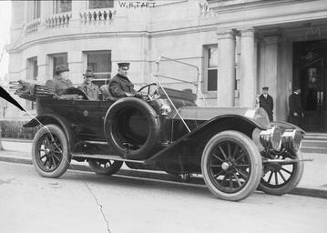 | Keywords: WHTaftMotorcar.jpg U S President William Howard Taft seated in back right of the car; at left of photo in his Pierce-Arrow touring car Unidentified man seated next to President Taft The driver is not identified but is likely Taft's official driver George Robinson Bain News Service photograph cracked glass negative via Library of Congress website http //hdl loc gov/loc pnp/ggbain 12970; converted from TIFF to jpg and border cropped before upload ca 1910 Unnamed photographer in employ of Bain News Service PD-Bain 1909 automobiles Presidential automobiles of the United States 1910 Pierce-Arrow automobiles 1909 William Howard Taft Sitting_men |