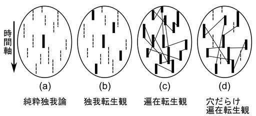 | Keywords: Why am i me 4.svg Classification of possible positions about question Why am I myself rather than someone else or Why am I here and now by Tsuneo Watanabe pschologist philosopher professor at Toho University Japan The arrow at left indicates direction of time Past top to Future down a Pure solipsism b Solipsistic reincarnationism c Universal reincarnationism d Universal reincarnationism full of holes Tsuneo Watanabe himself pushes position c because of he thinks that is most elegant Tsuneo Watanabe's literature 1996 p 175 ISBN 978-4061493032 2012-05-02 own Inkscape Philosophy of mind Reincarnation Diagrams in Japanese |