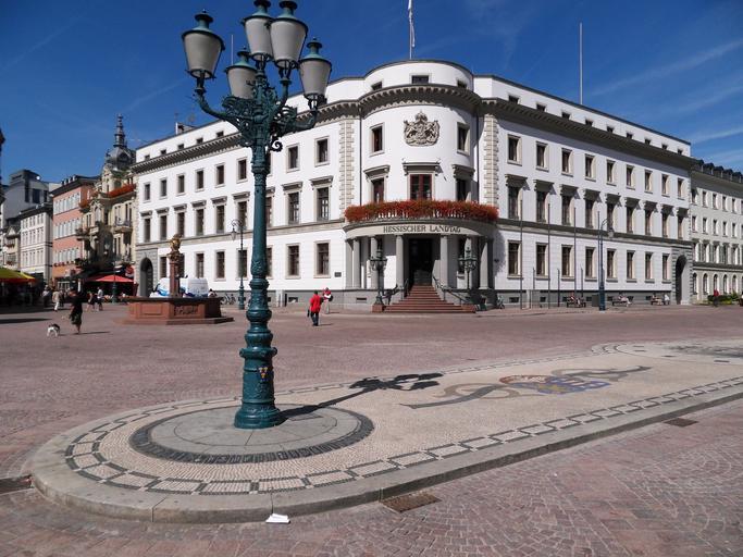 Keywords: WiesbadenSchlossplatzStadtschlossWappeninselKandelaber.JPG de Sitz des Hessischen Landtags im Stadtschloss Wiesbaden Blick von Südwesten über den Schlossplatz mit der restaurierten Wappeninsel mit den Wappen der preußischen Provinz Hessen-Nassau und des Königreichs Preußen aus buntem Mosaikpflaster dazu ein historischer vierarmiger Kandelaber own Brühl 2009-08-31 Exterior of Stadtschloss Wiesbaden Schloßplatz Wiesbaden Street lights in Hesse |