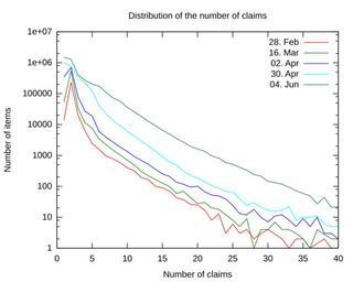 Keywords: Wikidata-Claimsperitem.svg de Verteilung der Anzahl von Aussagen pro Eintrag in Wikidata Stand Siehe Beschriftung fr Distribution du nombre de propriétés par élément de Wikidata Date voir la légende own Michael F Schönitzer 2013-03-11 Cc-zero gnuplot Work by Michael Schönitzer Wikidata statistics in English