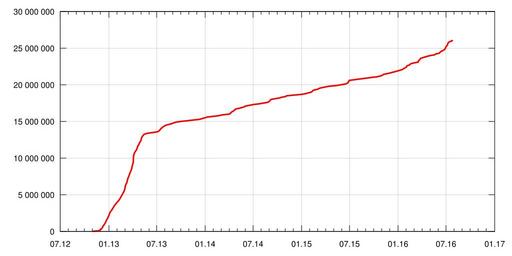 | Keywords: Wikidata item creation progress no text.svg recent en Plot of item creation by date for Wikidata Source Version history got over API de Plot der Entwicklung der Datenobjektzahlen auf Wikidata Quelle Versionsgeschichte über API abgerufen pt Gráfico que ilustra a criação de itens por data no Wikidata ru Г афик оста числа элементов Викиданных по дате Источник Исто ия ве сий получена че ез API own Pyfisch 2013-04-11 other fields Gnuplot + // Gnuplot plt file Update xrange and yrange if necessarry set term svg size 1000 500 fname 'Helvetica' fsize 16 set grid xtics ytics lt 1 lc rgb 0xAAAAAA lw 5 set xdata time set timefmt Y- m- dT H M SZ set format x m y set format y 6 0f set output wikidata_growth svg plot ausgabe using 1 2 title with lines lw 3 lc 'red'; syntax2 text none Gnuplot data // Used by Gnuplot updated if needed Date Numer of Elements 2012-10-29T18 18 48Z 1 2012-11-24T10 54 38Z 100000 2012-11-29T15 11 16Z 200000 2012-12-02T17 12 35Z 300000 2012-12-05T04 00 21Z 400000 2012-12-07T10 55 26Z 500000 2012-12-08T18 14 00Z 600000 2012-12-10T02 01 49Z 700000 2012-12-12T05 06 56Z 800000 2012-12-15T21 17 13Z 1000000 2012-12-17T14 55 14Z 1100000 2012-12-19T10 34 26Z 1200000 2012-12-20T15 12 10Z 1300000 2012-12-21T16 45 26Z 1400000 2012-12-23T00 14 52Z 1500000 2012-12-24T08 09 36Z 1600000 2012-12-25T22 58 04Z 1700000 2012-12-27T19 15 20Z 1800000 2012-12-28T21 15 33Z 1900000 2012-12-29T23 08 12Z 2000000 2012-12-31T05 12 29Z 2100000 2013-01-01T18 11 50Z 2200000 2013-01-02T19 21 33Z 2300000 2013-01-03T14 44 38Z 2400000 2013-01-04T13 38 43Z 2500000 2013-01-05T16 06 58Z 2600000 2013-01-09T19 01 39Z 2800000 2013-01-11T23 14 34Z 2900000 2013-01-13T22 17 57Z 3000000 2013-01-15T09 49 12Z 3100000 2013-01-17T03 10 52Z 3200000 2013-01-20T11 15 27Z 3400000 2013-01-24T03 49 32Z 3600000 2013-01-26T11 20 42Z 3700000 2013-01-28T19 09 49Z 3800000 2013-01-30T20 02 54Z 3900000 2013-02-02T06 54 04Z 4000000 2013-02-04T14 53 44Z 4100000 2013-02-07T08 24 52Z 4200000 2013-02-09T03 03 07Z 4300000 2013-02-11T04 12 26Z 4400000 2013-02-14T17 16 36Z 4600000 2013-02-15T23 55 37Z 4700000 2013-02-17T09 00 18Z 4800000 2013-02-19T02 41 51Z 4900000 2013-02-20T18 29 20Z 5000000 2013-02-22T07 13 15Z 5100000 2013-02-23T20 02 00Z 5200000 2013-02-25T03 51 01Z 5300000 2013-02-26T19 10 45Z 5400000 2013-02-27T22 54 48Z 5500000 2013-03-01T04 18 06Z 5600000 2013-03-02T01 43 16Z 5700000 2013-03-02T14 08 09Z 5800000 2013-03-03T04 04 28Z 5900000 2013-03-03T17 08 47Z 6000000 2013-03-04T05 42 17Z 6100000 2013-03-04T23 55 52Z 6200000 2013-03-05T17 03 37Z 6300000 2013-03-06T14 09 28Z 6400000 2013-03-08T01 44 00Z 6500000 2013-03-09T23 09 51Z 6600000 2013-03-11T09 41 21Z 6800000 2013-03-12T13 02 21Z 7000000 2013-03-13T06 28 51Z 7100000 2013-03-14T00 52 59Z 7200000 2013-03-15T06 01 24Z 7300000 2013-03-17T19 43 30Z 7500000 2013-03-18T14 15 36Z 7600000 2013-03-19T10 28 48Z 7700000 2013-03-20T18 15 50Z 7800000 2013-03-21T17 08 49Z 7900000 2013-03-22T14 18 16Z 8000000 2013-03-23T16 42 21Z 8100000 2013-03-24T23 13 36Z 8200000 2013-03-26T06 59 37Z 8300000 2013-03-27T07 28 12Z 8400000 2013-03-28T05 45 21Z 8500000 2013-03-29T03 35 20Z 8600000 2013-03-29T16 37 07Z 8700000 2013-03-30T04 58 23Z 8800000 2013-03-30T18 43 55Z 8900000 2013-03-31T11 07 42Z 9000000 2013-04-01T02 15 00Z 9100000 2013-04-02T00 49 16Z 9200000 2013-04-03T14 14 14Z 9400000 2013-04-03T18 50 02Z 9500000 2013-04-03T23 03 03Z 9600000 2013-04-04T05 01 44Z 9800000 2013-04-04T06 23 46Z 9900000 2013-04-04T07 46 41Z 10000000 2013-04-04T09 47 36Z 10100000 2013-04-04T11 45 41Z 10200000 2013-04-04T23 36 49Z 10300000 2013-04-05T17 34 08Z 10400000 2013-04-06T08 46 06Z 10500000 2013-04-08T06 50 59Z 10700000 2013-04-09T17 10 21Z 10800000 2013-04-17T01 23 38Z 11200000 2013-04-17T21 45 00Z 11300000 2013-04-18T20 45 32Z 11400000 2013-04-19T14 47 31Z 11500000 2013-04-20T12 19 15Z 11600000 2013-04-21T13 58 43Z 11700000 2013-04-24T02 22 47Z 11800000 2013-04-25T14 51 16Z 11900000 2013-04-26T08 49 37Z 12000000 2013-04-29T11 23 42Z 12200000 2013-05-01T12 35 41Z 12300000 2013-05-02T12 55 20Z 12400000 2013-05-03T10 14 03Z 12500000 2013-05-04T00 23 54Z 12600000 2013-05-04T17 15 56Z 12700000 2013-05-05T13 29 42Z 12800000 2013-05-08T23 50 55Z 13000000 2013-05-11T07 25 43Z 13100000 2013-05-13T11 10 01Z 13200000 2013-05-18T17 14 03Z 13300000 2013-05-27T16 39 21Z 13400000 2013-06-19T08 29 13Z 13500000 2013-07-04T07 21 11Z 13600000 2013-07-10T02 58 26Z 13700000 2013-07-12T04 15 59Z 13800000 2013-07-15T00 58 44Z 13900000 2013-07-16T23 59 31Z 14000000 2013-07-19T21 29 34Z 14100000 2013-07-23T20 31 09Z 14200000 2013-07-26T15 07 17Z 14300000 2013-07-31T22 17 23Z 14400000 2013-08-06T00 44 06Z 14500000 2013-08-16T18 03 55Z 14600000 2013-08-27T15 20 17Z 14700000 2013-09-03T12 53 40Z 14800000 2013-09-11T12 42 28Z 14900000 2013-09-30T05 53 10Z 15000000 2013-10-25T09 47 43Z 15100000 2013-11-17T23 42 21Z 15200000 2013-12-11T20 57 13Z 15300000 2013-12-21T04 23 13Z 15400000 2014-01-01T08 53 03Z 15500000 2014-01-07T08 53 41Z 15600000 2014-02-01T14 45 28Z 15700000 2014-02-23T05 20 32Z 15800000 2014-03-06T13 39 44Z 15900000 2014-04-01T14 42 55Z 16000000 2014-04-06T21 56 27Z 16100000 2014-04-08T09 49 24Z 16200000 2014-04-11T23 50 47Z 16300000 2014-04-20T20 12 23Z 16500000 2014-04-23T15 44 59Z 16600000 2014-04-26T16 50 24Z 16700000 2014-05-09T23 22 14Z 16800000 2014-05-29T18 38 43Z 17000000 2014-06-02T03 10 34Z 17100000 2014-06-16T14 50 31Z 17200000 2014-07-01T00 22 14Z 17300000 2014-07-22T19 51 49Z 17400000 2014-08-24T15 35 30Z 17600000 2014-08-30T14 12 35Z 17700000 2014-09-02T11 04 40Z 17800000 2014-09-07T00 37 32Z 18000000 2014-09-21T17 12 01Z 18100000 2014-10-09T08 33 10Z 18200000 2014-10-16T19 53 53Z 18300000 2014-11-01T10 22 54Z 18400000 2014-11-05T05 08 05Z 18500000 2015-01-01T10 32 30Z 18700000 2015-01-17T04 42 59Z 18800000 2015-01-26T06 02 39Z 18900000 2015-02-07T01 42 42Z 19000000 2015-02-10T06 30 18Z 19100000 2015-02-12T13 08 22Z 19200000 2015