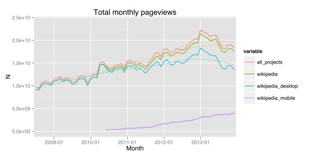 Keywords: Wikimedia sites pageviews.svg en Aggregate monthly pageviews for Wikimedia sites as a function of platform mobile vs desktop 2014-01-27 14 25 27 own DarTar cc-zero Uploaded with UploadWizard Wikipedia statistics