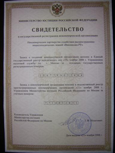 | Keywords: WikimediaRU-SvidetelstvoOGosRegistraciiNKO.jpg инисте ство Юстиции Российской Феде ации Свидетельство о госуда ственной егист ации некоммме ческой о ганизации екомме ческое па тне ство содействия асп ост анению энциклопедических знаний «Викимедиа РУ» Ministry of Justice of Russian Federation Certificate of State Registration of Non-Commercial Organization Non-Commercial Partnership of promotion of distribution of Encyclopedic Knowledge Wikimedia RU This is an official document and therefore it is not protected by the Russian Copyright Laws Therefore it is Public Domain in sense as it treated in Wikimedia meta wikimedia Jusjih 2008-11-27 Original uploader was Drbug at http //meta wikimedia org meta wikimedia PD-RU-exempt original upload log page meta wikimedia WikimediaRU-SvidetelstvoOGosRegistraciiNKO jpg 2008-11-27 10 41 Drbug 2448×3264× 1508180 bytes <nowiki> инисте ство Юстиции Российской Феде ации Свидетельство о госуда ственной егист ации некоммме ческой о ганизации екомме ческое па </nowiki> 2008-11-27 10 28 Drbug 2448×3264× 4446308 bytes <nowiki> инисте ство Юстиции Российской Феде ации Свидетельство о госуда ственной егист ации некоммме ческой о ганизации екомме ческое па </nowiki> Wikimedia Russia docs |