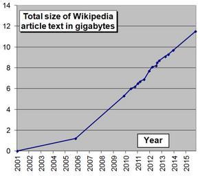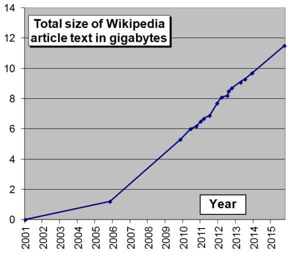 Keywords: Wikipedia article size in gigabytes.png graph size of Wikipedia measured in size of total article text in English Wikipedia in gigabytes GB compressed own based on en Wikipedia Database download Jan 2001; 0 0 GB Nov 2005; 1 2 GB Nov 2009; 5 3 GB Jun 2010; 6 0 GB Oct 2010; 6 2 GB Jan 2011; 6 5 GB Mar 2011; 6 7 GB Jul 2011; 6 9 GB Dec 2011; 7 7 GB Mar 2012; 8 1 GB Jul 2012; 8 2 GB Aug 2012; 8 5 GB Oct 2012; 8 7 GB Apr 2013; 9 1 GB Oct 2015; 11 5 GB Original excel file can be downloaded from https //docs google com/open id 0B8IdyPbSsy9rWlJDcGlCVUlBODA here Mikael Häggström Originally 2010-07-04 English Wikipedia statistics Line charts Gigabyte |