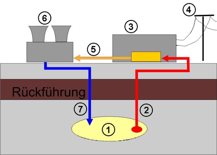 | Keywords: Wikipedia Geothermal PowerStation.png Wikipedia Geothermal PowerStation svg Skematiese voorstelling van 'n geotermiese kragstasie 1 Warmwaterbron 2 Warm water uit die Aarde 3 Elektriese kragopwekking d m v generator 4 Die opgewekte elektrisiteit word in die netwerk ingevoer 5 Daarna kan die res van die warm water nog gebruik word vir verwarming 6 Termiese energie kan verder benut word 7 Koue water word teruggevoer in die kringloop om weer deur die Aarde verwarm te kan word Schematics of a Geothermal Power Station 1 Hot water reservoir 2 Hot water from the Earth 3 Electrical power generation with generator 4 The generated electricity is fed into the network 5 Thereafter the rest of the hot water can still be used for heating purposes 6 Thermal energy can be reused 7 Cold water is fed back to the cycle to be reheated by the Earth Schematische Skizze eines geothermischen Kraftwerks 1 Heißwasser Reservoir 2 Heißwasser aus der Erde 3 Generierte Elektrizität durch Generator 4 Die generierte Elektrizität wird ins Netz eingespeist 5 Danach kann der Rest der Energie aus dem warmwen Wasser noch zu Heizungszwecken Verwendung finden 6 Thermische Energie kann wieder verwendet werden 7 Das kalte abgekühlte Wasser wird zurückgeleitet um den Kreislauf zu schließen und um erneut erwärmt zu werden Derivative of de Bild Geothermie verfahren png which is in the public domain 25 Jun 2005 original version 2007-11-26 this version Original author was Jkrieger at the German Wikipedia Alternative version by Pieter-ZA at the http //af wikipedia org Afrikaans Wikipedia Released into the public domain by the author Jkrieger de original upload log Transfer to Commons was made by Anrie page af wikipedia Wikipedia_Geothermal_PowerStation png 2007-11-26 15 33 Pieter-ZA 758×543×8 19193 bytes <nowiki>Schematics of Geothermal Power Station Own drawing - Changed Wiki Clip to International Version edited the out the Ttxt in the graphics Source found at http //de wikipedia org/wiki/Bild Geothermie_verfahren png</nowiki> Geothermal power plant schemas |