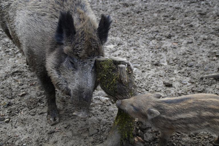 Keywords: wild boars bache launchy mother and child wild boar quagmire mud muddy scratching themselves scrub rub imitation learn behavior pigs