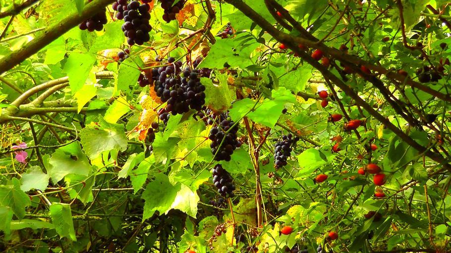Keywords: wild grapes rose hip sweet red grapes grapes wild growth green fruit healthy eat nutrition summer sun plant wine grape vine scrub leaves bush fruits wild rose bush nature of course free