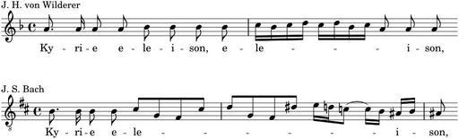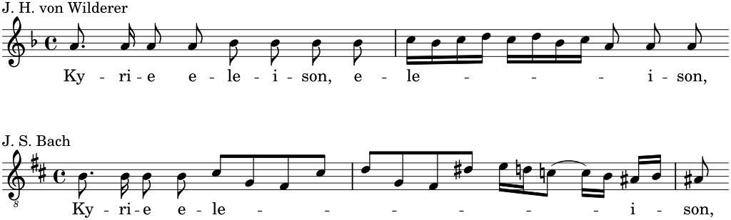 Keywords: Wilderer Bach BWV 232.svg de J S Bach h-Moll-Messe BWV 232 Kyrie Nr 1 Vergleich mit J H Wilderer own Wikiwal 2013-01-25 PD-old-auto-1923 1750 Lilipond source text <pre> \version 2 14 2 \header tagline f \paper indent 0\mm ragged-right f J H von Wilderer \score \new Staff \relative c' \autoBeamOff \key f \major \time 4/4 a'8 a16 a8 a bes bes bes bes c16 bes c d c d bes c a8 a a \addlyrics Ky -- ri -- e e -- le -- i -- son e -- le -- _ _ i -- son \header piece J H von Wilderer \markup \vspace 2 J S Bach \score \new Staff \relative c' \set Score currentBarNumber 30 \key d \major \clef G_8 \time 4/4 \autoBeamOff b8 b16 b8 b cis g fis cis' d g fis dis' e16 d c8 c16 b ais b ais8 \addlyrics Ky -- ri -- e e -- le -- _ _ i -- son \header piece J S Bach </pre> Mass in B minor Kyrie