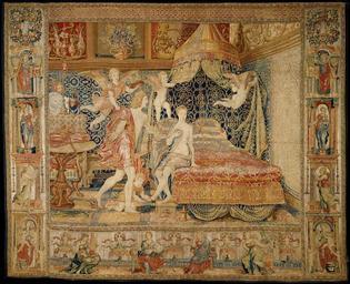 Keywords: Willem de Pannemaker03.jpg en The Bridal Chamber of Herse from a set of eight tapestries depicting the Story of Mercury and Herse Design attributed to Giovanni Battista Lodi da Cremona Italian active 1540 “52 After a print by Giovanni Jacopo Caraglio Italian Parma or Verona ca 1500/1505 “1565 Krakow Border design attributed to Giovanni Francesco Penni Italian Florence ca 1496 “after 1528 Naples Weaver Weaving workshop directed by Willem de Pannemaker Brussels active 1535 “1578 Date ca 1550 Culture Flemish Brussels Medium Wool silk silver silver-gilt thread 20 “22 warps per in 8 “9 per cm Dimensions Overall 172 x 213 in 436 9 x 541 cm Accession Number 41 190 135 http //images metmuseum org/CRDImages/es/original/DT808 jpg Giovanni Battista Lodi da Cremona fl1540-52 Giovanni Jacopo Caraglio c1500-65 Giovanni Francesco Penni c1496-c1528 Willem de Pannemaker fl1535-78 ~ 1550 PD-old-100 Willem de Pannemaker Herse Mercurius deus Tapestry of Italy Unidentified locations of tapestries