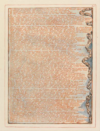 | Keywords: William Blake - Jerusalem, Plate 65, "To decide Two Worlds...." - Google Art Project.jpg print orange pen ink black watercolor paper cream Relief etching printed in orange with pen and black ink and watercolor on moderately thick smooth cream wove paper London 1757 London 1827 William male 2369124 Blake British 1757 - 1827 /collection/yale-center-for-british-art/artwork/jerusalem-plate-65-to-decide-two-worlds-william-blake/2370881/ William Blake Artist /artist/william-blake/4130035/ 4130035 /collection/yale-center-for-british-art/ Yale Center for British Art 2305845 http //britishart yale edu/ 2/23/2012 9 47 26 PM /collection/yale-center-for-british-art/artwork/jerusalem-plate-65-to-decide-two-worlds-william-blake/2370881/ 1804 1804 to 1820 sky chains text historical subject Relief etching printed in orange with pen and black ink and watercolor on moderately thick smooth cream wove paper 223 2370881 False 1820 3/24/2012 2 58 24 PM YCBA/lido-TMS-3498 http //collections britishart yale edu/vufind/Record/1667786 Yale Center for British Art Paul Mellon Collection print 1800 1830 Felpham Creation w162 x h223 cm 1804 to 1820 False 0 763671875 Volume jerusalem-plate-65-to-decide-two-worlds-william-blake Jerusalem Plate 65 To decide Two Worlds j 162 No inscription Inscription _Signed_and_Dated Not signed not dated Not on View Relief etching printed in orange with pen and black ink and watercolor on moderately thick smooth cream wove paper sky chains text historical subject special url_id eQFQwqlooQkgpQ PD-old-100-1923 1827 Jerusalem The Emanation of the Giant Albion - copy E 065 Google Art Project works by William Blake |