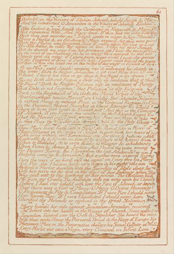 | Keywords: William Blake - Jerusalem, Plate 61, "Behold- in the Visions of Elohim Jehovah...." - Google Art Project.jpg print orange pen ink black watercolor paper cream Relief etching printed in orange with pen and black ink and watercolor on moderately thick smooth cream wove paper London 1757 London 1827 William male 2369124 Blake British 1757 - 1827 /collection/yale-center-for-british-art/artwork/jerusalem-plate-61-behold-in-the-visions-of-elohim-jehovah-william-blake/2371782/ William Blake Artist /artist/william-blake/4130035/ 4130035 /collection/yale-center-for-british-art/ Yale Center for British Art 2305845 http //britishart yale edu/ 2/23/2012 9 47 21 PM /collection/yale-center-for-british-art/artwork/jerusalem-plate-61-behold-in-the-visions-of-elohim-jehovah-william-blake/2371782/ 1804 1804 to 1820 birds text historical subject Relief etching printed in orange with pen and black ink and watercolor on moderately thick smooth cream wove paper 225 2371782 False 1820 3/24/2012 3 06 46 PM YCBA/lido-TMS-3494 http //collections britishart yale edu/vufind/Record/1667782 Yale Center for British Art Paul Mellon Collection print 1800 1830 Felpham Creation w143 x h225 cm 1804 to 1820 False 0 685546875 Volume jerusalem-plate-61-behold-in-the-visions-of-elohim-jehovah-william-blake Jerusalem Plate 61 Behold in the Visions of Elohim Jehovah j 143 No inscription Inscription _Signed_and_Dated Not signed not dated Not on View Relief etching printed in orange with pen and black ink and watercolor on moderately thick smooth cream wove paper birds text historical subject special url_id dQEvG5Nr2SyRnA PD-old-100-1923 1827 Jerusalem The Emanation of the Giant Albion - copy E 061 Google Art Project works by William Blake |