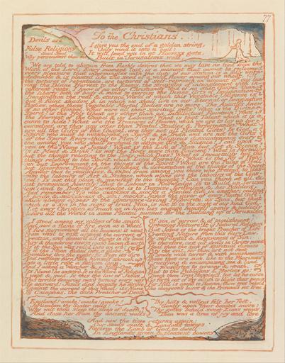 | Keywords: William Blake - Jerusalem, Plate 77, "To the Christians...." - Google Art Project.jpg print orange pen ink black watercolor paper cream Relief etching printed in orange with pen and black ink and watercolor on moderately thick smooth cream wove paper London 1757 London 1827 William male 2369124 Blake British 1757 - 1827 /collection/yale-center-for-british-art/artwork/jerusalem-plate-77-to-the-christians-william-blake/2385269/ William Blake Artist /artist/william-blake/4130035/ 4130035 /collection/yale-center-for-british-art/ Yale Center for British Art 2305845 http //britishart yale edu/ 2/23/2012 9 47 46 PM /collection/yale-center-for-british-art/artwork/jerusalem-plate-77-to-the-christians-william-blake/2385269/ 1804 1804 to 1820 clouds children rope string leaf smoke spool text text historical subject historical subject Relief etching printed in orange with pen and black ink and watercolor on moderately thick smooth cream wove paper 222 2385269 False 1820 3/24/2012 4 29 44 PM YCBA/lido-TMS-3511 http //collections britishart yale edu/vufind/Record/1667802 Yale Center for British Art Paul Mellon Collection print 1800 1830 London Creation w169 x h222 cm 1804 to 1820 False 0 78515625 Volume jerusalem-plate-77-to-the-christians-william-blake Jerusalem Plate 77 To the Christians j 169 No inscription Inscription _Signed_and_Dated Not signed not dated Not on View Relief etching printed in orange with pen and black ink and watercolor on moderately thick smooth cream wove paper clouds children rope string leaf smoke spool text text historical subject historical subject special url_id 1gGclJJmDvt-6Q PD-old-100-1923 1827 Jerusalem The Emanation of the Giant Albion - copy E 077 Google Art Project works by William Blake |