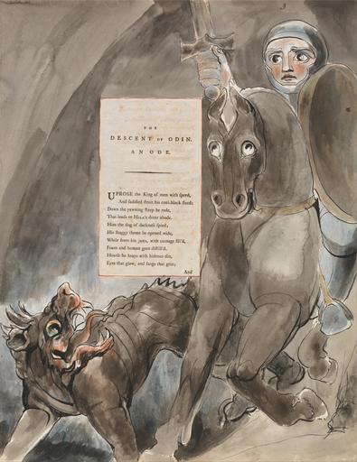 | Keywords: William Blake - The Poems of Thomas Gray, Design 79, "The Descent of Odin." - Google Art Project.jpg watercolor pen ink black graphite paper cream Watercolor with pen and black ink and graphite on moderately thick moderately textured cream wove paper London 1757 London 1827 William male 2369124 Blake British 1757 - 1827 /collection/yale-center-for-british-art/artwork/the-poems-of-thomas-gray-design-79-the-descent-of-odin-william-blake/2391066/ William Blake Artist /artist/william-blake/4130035/ 4130035 /collection/yale-center-for-british-art/ Yale Center for British Art 2305845 http //britishart yale edu/ 2/23/2012 9 50 48 PM /collection/yale-center-for-british-art/artwork/the-poems-of-thomas-gray-design-79-the-descent-of-odin-william-blake/2391066/ 1797 between 1797 and 1798 wolf dog soldier horse animal horse animal flame man men fire armor text shield helmets sword historical subject knight landholder Watercolor with pen and black ink and graphite on moderately thick slightly textured cream wove paper with inlaid letterpress page 419 2391066 False 1798 3/25/2012 9 15 59 PM YCBA/lido-TMS-3671 http //collections britishart yale edu/vufind/Record/1667930 Yale Center for British Art Paul Mellon Collection painting 1790 1800 London Creation w324 x h419 cm between 1797 and 1798 False 0 771484375 Volume the-poems-of-thomas-gray-design-79-the-descent-of-odin-william-blake The Poems of Thomas Gray Design 79 The Descent of Odin p 324 Inscribed in black ink upper right 3 ; in graphite center + Inscription _Signed_and_Dated Not signed not dated Not on View Watercolor with pen and black ink and graphite on moderately thick slightly textured cream wove paper with inlaid letterpress page wolf dog soldier horse animal horse animal flame man men fire armor text shield helmets sword historical subject knight landholder special url_id YAH3H-wiNnTMAQ PD-old-100-1923 1827 William Blake's illustrations to Thomas Gray's Poems Google Art Project works by William Blake |
