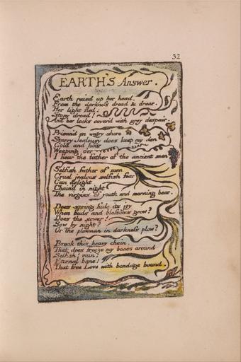 | Keywords: William Blake - Songs of Innocence and of Experience, Plate 32, "Earth's Answer" (Bentley 31) - Google Art Project.jpg print brown pen ink black watercolor paper cream Relief etching printed in dark-brown with pen and black ink and watercolor on moderately thick slightly textured cream wove paper London 1757 London 1827 William male 2369124 Blake British 1757 - 1827 /collection/yale-center-for-british-art/artwork/songs-of-innocence-and-of-experience-plate-32-earths-answer-bentley-31-william-blake/2395010/ William Blake Artist /artist/william-blake/4130035/ 4130035 /collection/yale-center-for-british-art/ Yale Center for British Art 2305845 http //britishart yale edu/ 2/23/2012 9 52 13 PM /collection/yale-center-for-british-art/artwork/songs-of-innocence-and-of-experience-plate-32-earths-answer-bentley-31-william-blake/2395010/ 1789 1789 to 1794 branches leaf serpent snake fruit text vegetation vines historical subject Relief etching printed in dark-brown with pen and black ink and watercolor on moderately thick slightly textured cream wove paper 117 2395010 False 1794 3/25/2012 9 18 38 PM YCBA/lido-TMS-3753 http //collections britishart yale edu/vufind/Record/1667997 Yale Center for British Art Paul Mellon Collection print 1780 1800 Felpham Creation w73 x h117 cm 1789 to 1794 False 0 6640625 Volume songs-of-innocence-and-of-experience-plate-32-earths-answer-bentley-31-william-blake Songs of Innocence and of Experience Plate 32 Earth's Answer Bentley 31 s 73 Inscribed in black ink upper right 32 Inscription _Signed_and_Dated Not signed not dated Not on View Relief etching printed in dark-brown with pen and black ink and watercolor on moderately thick slightly textured cream wove paper branches leaf serpent snake fruit text vegetation vines historical subject special url_id HgHaRXT-SKUHGQ PD-old-100-1923 1827 Songs of Innocence and Experience - Copy L Google Art Project works by William Blake Songs of Experience - Earth's Answer |