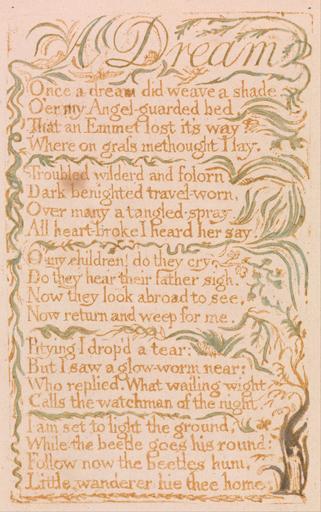 | Keywords: William Blake - Songs of Innocence, Plate 4, "A Dream" (Bentley 26) - Google Art Project.jpg print brown watercolor paper cream Relief etching printed in brown with watercolor on moderately thick slightly textured cream wove paper London 1757 London 1827 William male 2369124 Blake British 1757 - 1827 /collection/yale-center-for-british-art/artwork/songs-of-innocence-plate-4-a-dream-bentley-26-william-blake/2378606/ William Blake Artist /artist/william-blake/4130035/ 4130035 /collection/yale-center-for-british-art/ Yale Center for British Art 2305845 http //britishart yale edu/ 2/23/2012 9 51 29 PM /collection/yale-center-for-british-art/artwork/songs-of-innocence-plate-4-a-dream-bentley-26-william-blake/2378606/ 1789 1789 birds leaf kissing pointing serpent snake men women text vegetation trees vines historical subject Relief etching printed in brown with watercolor on moderately thick slightly textured cream wove paper 111 2378606 False 1789 3/24/2012 3 48 30 PM YCBA/lido-TMS-3720 http //collections britishart yale edu/vufind/Record/1667966 Yale Center for British Art Paul Mellon Collection print 1780 1790 Felpham Creation w67 x h111 cm 1789 False 0 626953125 Volume songs-of-innocence-plate-4-a-dream-bentley-26-william-blake Songs of Innocence Plate 4 A Dream Bentley 26 s 67 No inscription Inscription _Signed_and_Dated Not signed not dated Not on View Relief etching printed in brown with watercolor on moderately thick slightly textured cream wove paper birds leaf kissing pointing serpent snake men women text vegetation trees vines historical subject special url_id nwE2tZsv6a17PA PD-old-100-1923 1827 Songs of Innocence - Dream Google Art Project works by William Blake Songs of Innocence - Copy G 1789 |