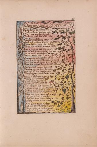 | Keywords: William Blake - Songs of Innocence and of Experience, Plate 28, "On Anothers Sorrow" (Bentley 27) - Google Art Project.jpg print brown pen ink black watercolor paper cream Relief etching printed in dark-brown with pen and black ink and watercolor on moderately thick slightly textured cream wove paper London 1757 London 1827 William male 2369124 Blake British 1757 - 1827 /collection/yale-center-for-british-art/artwork/songs-of-innocence-and-of-experience-plate-28-on-anothers-sorrow-bentley-27-william-blake/2388400/ William Blake Artist /artist/william-blake/4130035/ 4130035 /collection/yale-center-for-british-art/ Yale Center for British Art 2305845 http //britishart yale edu/ 2/23/2012 9 52 05 PM /collection/yale-center-for-british-art/artwork/songs-of-innocence-and-of-experience-plate-28-on-anothers-sorrow-bentley-27-william-blake/2388400/ 1789 1789 to 1794 birds branches leaf text vegetation trees vines historical subject Relief etching printed in dark-brown with pen and black ink and watercolor on moderately thick slightly textured cream wove paper 114 2388400 False 1794 3/25/2012 6 22 45 PM YCBA/lido-TMS-3748 http //collections britishart yale edu/vufind/Record/1667991 Yale Center for British Art Paul Mellon Collection print 1780 1800 London Creation w73 x h114 cm 1789 to 1794 False 0 66015625 Volume songs-of-innocence-and-of-experience-plate-28-on-anothers-sorrow-bentley-27-william-blake Songs of Innocence and of Experience Plate 28 On Anothers Sorrow Bentley 27 s 73 Inscribed in black ink upper right 28 Inscription _Signed_and_Dated Not signed not dated Not on View Relief etching printed in dark-brown with pen and black ink and watercolor on moderately thick slightly textured cream wove paper birds branches leaf text vegetation trees vines historical subject special url_id NQHVJkASSkVTgQ PD-old-100-1923 1827 Songs of Innocence and Experience - Copy L Google Art Project works by William Blake Category Songs of Innocence Songs of Innocence - On Anothers Sorrow Category William Blake |