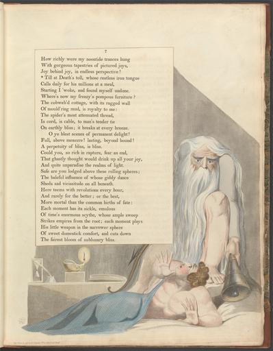 | Keywords: William Blake - Young's Night Thoughts, Page 7, "Till at Death's toll, whose restless iron tongue" - Google Art Project.jpg ~ 1797 etching line engraving watercolor paper cream Etching and line engraving with watercolor on moderately thick slightly textured cream wove paper London 1757 London 1827 William male 2369124 Blake British 1757 - 1827 /collection/yale-center-for-british-art/artwork/youngs-night-thoughts-page-7-till-at-deaths-toll-whose-restless-iron-tounge-william-blake/2455261/ William Blake Artist /artist/william-blake/4130035/ 4130035 /collection/yale-center-for-british-art/ Yale Center for British Art 2305845 http //britishart yale edu/ 2/24/2012 12 21 48 AM /collection/yale-center-for-british-art/artwork/youngs-night-thoughts-page-7-till-at-deaths-toll-whose-restless-iron-tounge-william-blake/2455261/ 1792 ca 1797 sun dead men death text lamps crowns quill pen spears bows bells hourglass historical subject books arrows Etching and line engraving with watercolor on moderately thick slightly textured cream wove paper 410 2455261 False 1802 3/25/2012 12 27 13 AM YCBA/lido-TMS-7461 http //collections britishart yale edu/vufind/Record/1670896 Yale Center for British Art Paul Mellon Collection print 1790 1810 Felpham Creation w324 x h410 cm ca 1797 False 0 779296875 Item youngs-night-thoughts-page-7-till-at-deaths-toll-whose-restless-iron-tounge-william-blake Young's Night Thoughts Page 7 Till at Death's toll whose restless iron tounge y 324 No inscription Inscription _Signed_and_Dated Not signed not dated Not on View Etching and line engraving with watercolor on moderately thick slightly textured cream wove paper sun dead men death text lamps crowns quill pen spears bows bells hourglass historical subject books arrows special url_id 1wGQ2WblhykgvA PD-old-100-1923 1827 William Blake's illustrations to Young's Night Thoughts Google Art Project works by William Blake |