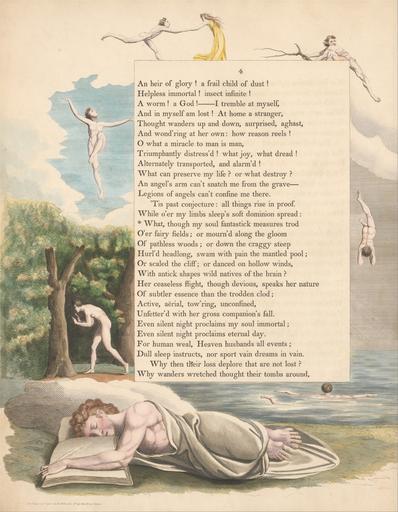 | Keywords: William Blake - Young's Night Thoughts, Page 4, "What, though My Soul Fantastick Measures Trod" - Google Art Project.jpg etching line engraving watercolor paper cream Etching and line engraving with watercolor on moderately thick slightly textured cream wove paper London 1757 London 1827 William male 2369124 Blake British 1757 - 1827 /collection/yale-center-for-british-art/artwork/youngs-night-thoughts-page-4-what-though-my-soul-fantastick-measures-trod-william-blake/2390036/ William Blake Artist /artist/william-blake/4130035/ 4130035 /collection/yale-center-for-british-art/ Yale Center for British Art 2305845 http //britishart yale edu/ 2/23/2012 9 48 58 PM /collection/yale-center-for-british-art/artwork/youngs-night-thoughts-page-4-what-though-my-soul-fantastick-measures-trod-william-blake/2390036/ 1797 1797 branches sleeping women men swimming text trees quill pen pen nudes historical subject book Etching and line engraving with watercolor on moderately thick slightly textured cream wove paper 445 2390036 False 1797 3/24/2012 5 02 10 PM YCBA/lido-TMS-3559 http //collections britishart yale edu/vufind/Record/1667852 Yale Center for British Art Paul Mellon Collection print 1790 1800 London Creation w327 x h445 cm 1797 False 0 77734375 Volume youngs-night-thoughts-page-4-what-though-my-soul-fantastick-measures-trod-william-blake Young's Night Thoughts Page 4 What though My Soul Fantastick Measures Trod y 327 No inscription Inscription _Signed_and_Dated Not signed not dated Not on View Etching and line engraving with watercolor on moderately thick slightly textured cream wove paper branches sleeping women men swimming text trees quill pen pen nudes historical subject book special url_id YwEfemKaW_YUpg PD-old-100-1923 1827 William Blake's illustrations to Young's Night Thoughts 004 Google Art Project works by William Blake |