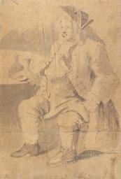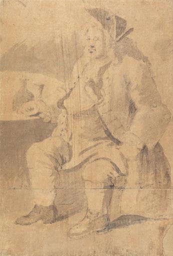 Keywords: William Hogarth - Gabriel Hunt - Google Art Project.jpg Inscribed in graphite verso lower center Richard Justian card maker Not on View Black chalk with gray wash over graphite on medium slightly textured beige laid paper men tables support furniture hats cuff links breeches trousers stockings coats vests main garments wigs shoes footwear bottles portraits special url_id BgGjYvNwlUjbag PD-old-100-1923 1764 William Hogarth Google Art Project works by William Hogarth Google Art Project