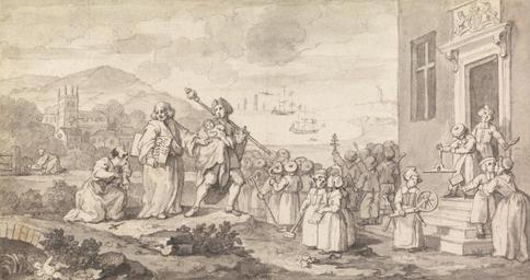 | Keywords: William Hogarth - Study for the Foundlings - Google Art Project.jpg Not on View Black ink with gray wash on medium smooth cream laid paper clouds spinning wheels orphans children people by age group infants leaf plant material doorways windows steps churches arch bridges hills trees fences bonnets hats hats breeches trousers stockings coats robes dresses sails rakes gowns shoes footwear ships genre subject shakos special url_id CgFGtTgJ86no9A PD-old-100-1923 1764 William Hogarth Google Art Project works by William Hogarth |