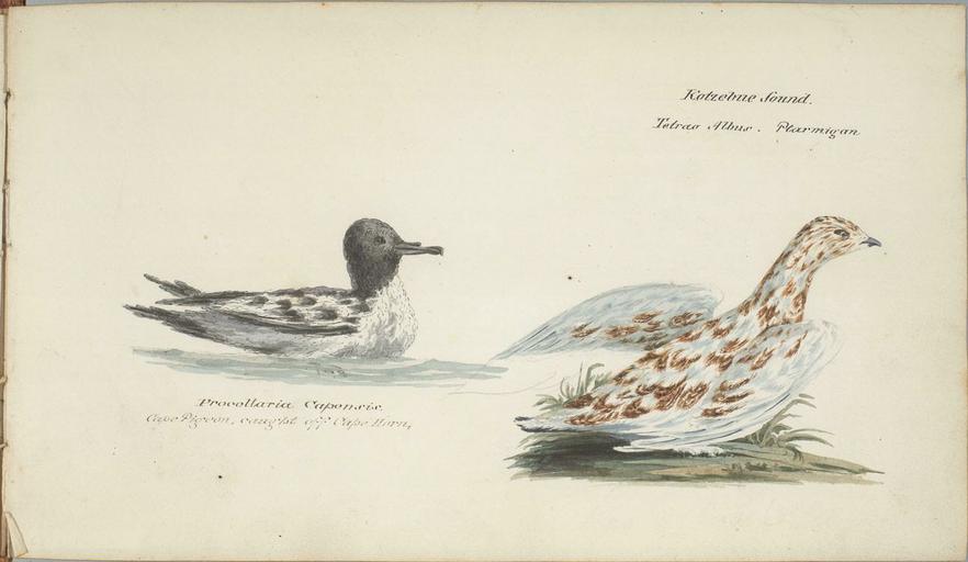 Keywords: William Smyth cape pigeon.jpg Procellaria Capensis Cape Pigeon caught off Cape Horn and Kotzebue Sound Tetrao Albus Ptarmigan Drawing on paper watercolor Dimensions 13 7 x 23 7 cm UC Berkeley Bancroft Library<br> Object ID BANC PIC 1963 002 1303 04--AL B <br> Downloaded from http //lunaweb giza tulane edu/luna/servlet/detail/MOAC~100~1~120993~46730 Procellaria-Capensis -Cape-Pigeon circa 1825 1827 William Smyth 1800-1877 PD-100 William Smyth 1800-1877 Daption capense |