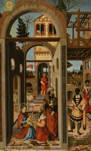 | Keywords: William Stetter - Adoration of the Three Kings - Walters 372619.jpg The wise men who according to the Gospels came from the East to adore the Christ Child and acknowledge his divinity were often depicted as kings underscoring the importance of their homage The star that they followed is in the upper left corner The oldest king a regal European kneels before the Child and his mother The middle-aged Turkish potentate wearing a turban looks back through the doorway in the ruin where the holy family has taken refuge toward the youngest ruler a vigorous young African attired in elegant 16th-century German fashion His facial features are more individualized than those of the other two and it may be that he is based on a study made from life In the distance some of the kings' followers ride horses with very long necks surely the artist's attempt at camels The painter has created a kind of stage set for his drama using a perspective system made popular by his famous fellow countryman Albrecht Dürer The receding lines marked out in the masonry go back more or less to one point the hand of the man in the doorway at center 1526 Early Modern oil on panel Overall cm 87 3 54 ; Framed 37 7/8 x 24 7/16 x 2 3/8 96 2 x 62 07 x 6 03 cm accession number 37 2619 29860 Sara D Redmond Oyster Bay New York by purchase Walters Art Museum Henry Walters Bequest of Sara D Redmond 1985 place of origin Strasbourg Germany Walters Art Museum license 2D William Stetter 1526 paintings Renaissance paintings in the Walters Art Museum 16th-century religious paintings in the United States 16th-century paintings of the Adoration of the Magi 16th-century oil on panel paintings in the United States 1520s paintings in the United States 1520s religious paintings 1520s paintings from Germany |