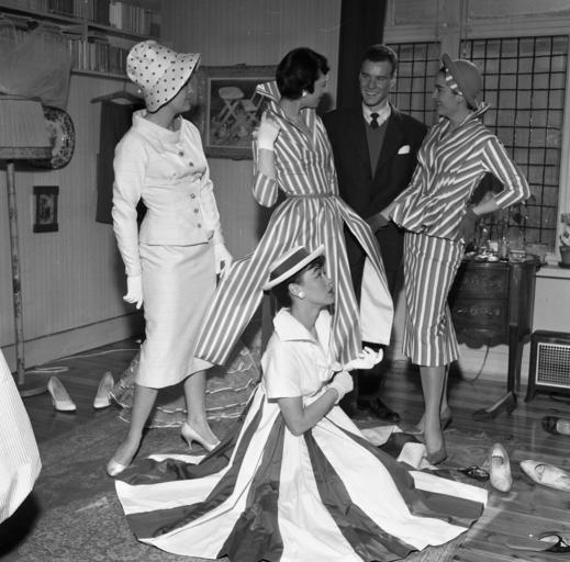Keywords: mote klær design art fashion clothes haute couturier blackandwhite monochrome black and white Visning av William Duborgh Jensens aller første kolleksjon i Riddervoldsgate 9 på Frogner i Oslo, våren 1958. Modellene: Margaret (t.v.), Theresa, Bjørg og Lill-Ann (sittende) sammmen med William. Fotograf: Strand Arkivreferanse: PA-0797_Ud_2271_002_001 Visning av William Duborgh Jensens aller første kolleksjon i Riddervoldsgate 9 på Frogner i Oslo, våren 1958. Modellene: Margaret (t.v.), Theresa, Bjørg og Lill-Ann (sittende) sammmen med William. Fotograf: Strand Arkivreferanse: PA-0797_Ud_2271_002_001