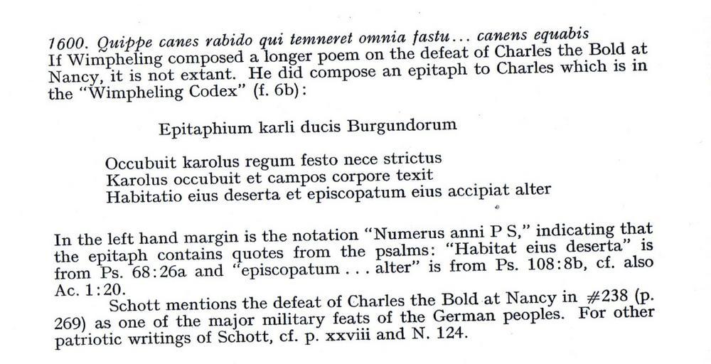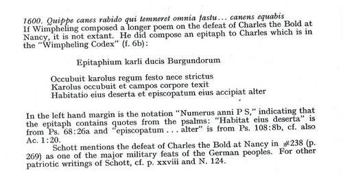 Keywords: Wimpfeling epitaphium karoli.jpg Epitaph on Charles the Bold d 1477 ny Jakob Wimpfeling Cod Uppsala Univ Library C 687 fol 6v The Works of Peter Schott 1460-1490 Ed Murray A and Marian L Cowie vol 2 Chapel Hill 1963 S 656 ~ 1477 Jakob Wimpfeling PD-old Jakob Wimpfeling |