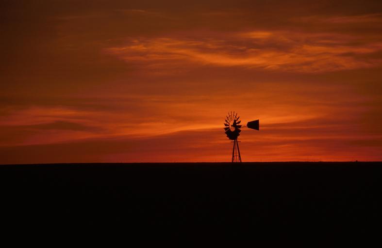 Keywords: windmill sunset western silhouette sky old vane landscape orange blades picturesque rural dusk twilight