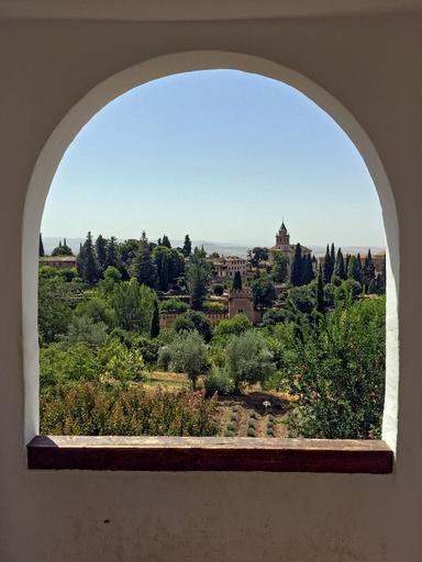 Keywords: window archway arch architecture spain granada alhambra sunny view picturesque landscape castle landmark traditional white history architectural old tourism