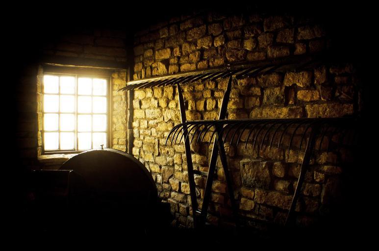 Keywords: window barn rakes farm equipment tools wall brick architecture england light glow background