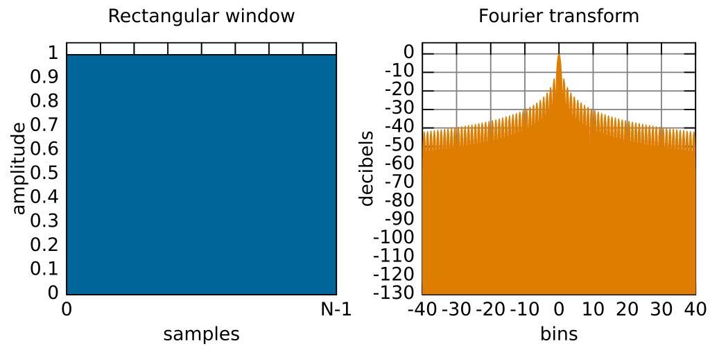 | Keywords: Window function and frequency response - Rectangular.svg  en Window function and its Fourier transform Rectangular window 2013-02-13 04 44 18 own Bob K original version Olli Niemitalo BobQQ The SVG images generated by the enclosed Octave source code replace the older PNG images cc-zero Octave script The script below generates these SVG images File Window function and frequency response - Bartlett-Hann svg File Window function and frequency response - Blackman svg File Window function and frequency response - Blackman-Harris svg File Window function and frequency response - Blackman-Nuttall svg File Window function and frequency response - Approximate confined Gaussian sigma t 0 1N svg File Window function and frequency response - Confined Gaussian sigma t 0 1N svg File Window function and frequency response - Cosine svg File Window function and frequency response - Dolph-Chebyshev alpha 5 svg File Window function and frequency response - DPSS alpha 2 svg File Window function and frequency response - DPSS alpha 3 svg File Window function and frequency response - Exponential 60dB decay svg File Window function and frequency response - Exponential half window decay svg File Window function and frequency response - Gaussian sigma 0 4 svg File Window function and frequency response - Hamming alpha 0 53836 svg File Window function and frequency response - Hann svg File Window function and frequency response - Hann-Poisson alpha 2 svg File Window function and frequency response - Kaiser alpha 2 svg File Window function and frequency response - Kaiser alpha 3 svg File Window function and frequency response - Lanczos svg File Window function and frequency response - Nuttall continuous first derivative svg File Window function and frequency response - Parzen svg File Window function and frequency response - Planck-Bessel epsilon 0 1 alpha 4 45 svg File Window function and frequency response - Planck-taper epsilon 0 1 svg File Window function and frequency response - Rectangular svg File Window function and frequency response - SRS flat top svg File Window function and frequency response - Triangular svg File Window function and frequency response - Tukey alpha 0 5 svg File Window function and frequency response - Welch svg The script is not MATLAB-compatible <source lang matlab > pkg load signal graphics_toolkit gnuplot set 0 defaultaxesfontname sans-serif set 0 defaultaxesfontsize 12 set 0 defaultaxeslinewidth 1 function plotWindow w wname wfilename wspecifier wfilespecifier M 32; Fourier transform size as multiple of window length Q 512; Number of samples in time domain plot P 40; Maximum bin index drawn dr 130; Maximum attenuation dB drawn in frequency domain plot N length w ; B N sum w 2 /sum w 2 noise bandwidth bins k 0 1/Q 1; w2 interp1 0 1/ N-1 1 w k ; if M/N < Q Q M/N; endif figure 'position' 1 1 1200 600 subplot 1 2 1 area k w2 'FaceColor' 0 0 4 0 6 'edgecolor' 0 0 0 'linewidth' 1 if min w > -0 01 ylim 0 1 05 set gca 'YTick' 0 0 1 1 else ylim -1 5 set gca 'YTick' -1 1 5 endif ylabel 'amplitude' set gca 'XTick' 0 1/8 1 set gca 'XTickLabel' ' 0'; ' '; ' '; ' '; ' '; ' '; ' '; ' '; 'N-1' grid 'on' set gca 'gridlinestyle' '-' xlabel 'samples' if strcmp wspecifier title cstrcat wname ' window' 'interpreter' 'none' else title cstrcat wname ' window ' wspecifier ' ' 'interpreter' 'none' endif set gca 'Position' 0 094 0 17 0 38 0 71 H abs fft w zeros 1 M-1 N ; H fftshift H ; H H/max H ; H 20 log10 H ; H max -dr H ; k 1 M N-1-M N/2 /M; k2 -P 1/M P; H2 interp1 k H k2 ; subplot 1 2 2 set gca 'FontSize' 28 h stem k2 H2 '-' ; set h 'BaseValue' -dr xlim -P P ylim -dr 6 set gca 'YTick' 0 -10 -dr set findobj 'Type' 'line' 'Marker' 'none' 'Color' 0 8710 0 49 0 grid 'on' set findobj 'Type' 'gridline' 'Color' 871 49 0 set gca 'gridlinestyle' '-' ylabel 'decibels' xlabel 'bins' title 'Fourier transform' set gca 'Position' 0 595 0 17 0 385 0 71 if strcmp wfilename wfilename wname; endif if strcmp wfilespecifier wfilespecifier wspecifier; endif if strcmp wfilespecifier savetoname cstrcat 'Window function and frequency response - ' wfilename ' svg' ; else savetoname cstrcat 'Window function and frequency response - ' wfilename ' ' wfilespecifier ' svg' ; endif print savetoname '-dsvg' '-S1200 600' close endfunction N 2 17; Window length B is equal for Triangular and Bartlett from 2 17 k 0 N-1; s 0 1 N; w exp - k - N - 1 /2 2 / 4 s 2 - exp - -1/2 - N - 1 /2 2 / 4 s 2 exp - k+N - N - 1 /2 2 / 4 s 2 + exp - k-N - N - 1 /2 2 / 4 s 2 / exp - -1/2+N - N - 1 /2 2 / 4 s 2 + exp - -1/2 - N - N - 1 /2 2 / 4 s 2 ; plotWindow w App conf Gaussian Approximate confined Gaussian ' 0 1N' sigma_t 0 1N ; w parzenwin N '; plotWindow w Parzen ; w 1- k- N-1 /2 / N+1 /2 2; plotWindow w Welch ; alpha 5; Attenuation in 20 dB units w chebwin N alpha 20 '; plotWindow w Dolph Chebyshev Dolph-Chebyshev ' 5' alpha 5 w 0 35875 - 0 48829 cos 2 pi k/ N-1 + 0 14128 cos 4 pi k/ N-1 -0 01168 cos 6 pi k/ N-1 ; plotWindow w Blackman Harris Blackman-Harris w 0 62 -0 48 abs k/ N-1 -0 5 +0 38 cos 2 pi k/ N-1 -0 5 ; plotWindow w Bartlett Hann Bartlett-Hann w 0 53836 - 0 46164 cos 2 pi k/ N-1 ; plotWindow w Hamming Hamming ' 0 53836' alpha 0 53836 w 1 - 1 93 cos 2 pi k/ N-1 + 1 29 cos 4 pi k/ N-1 -0 388 cos 6 pi k/ N-1 +0 028 cos 8 pi k/ N-1 ; plotWindow w SRS flat top alpha 2; w 1/2 1 - cos 2 pi k/ N-1 exp alpha abs N-2 k-1 / 1-N ; plotWindow w Hann Poisson Hann-Poisson ' 2' alpha 2 w 0 42 - 0 5 cos 2 pi k/ N-1 + 0 08 cos 4 pi k/ N-1 ; plotWindow w Blackman w 0 355768 - 0 487396 cos 2 pi k/ N-1 + 0 144232 cos 4 pi k/ N-1 -0 012604 cos 6 pi k/ N-1 ; plotWindow w Nuttall Nuttall continuous first derivative w ones 1 N ; plotWindow w Rectangular w N/2 - abs k- N-1 /2 / N/2 ; plotWindow w Triangular w 0 5 - 0 5 cos 2 pi k/ N-1 ; plotWindow w Hann alpha 0 5; w ones 1 N ; n - N-1 /2 -alpha N/2; L length n ; w 1 L 0 5 1+cos pi abs n -alpha N/2 / 1-alpha N/2 ; w N -1 N-L+1 w 1 L ; plotWindow w Tukey Tukey ' 0 5' alpha 0 5 w sin pi k/ N-1 ; plotWindo