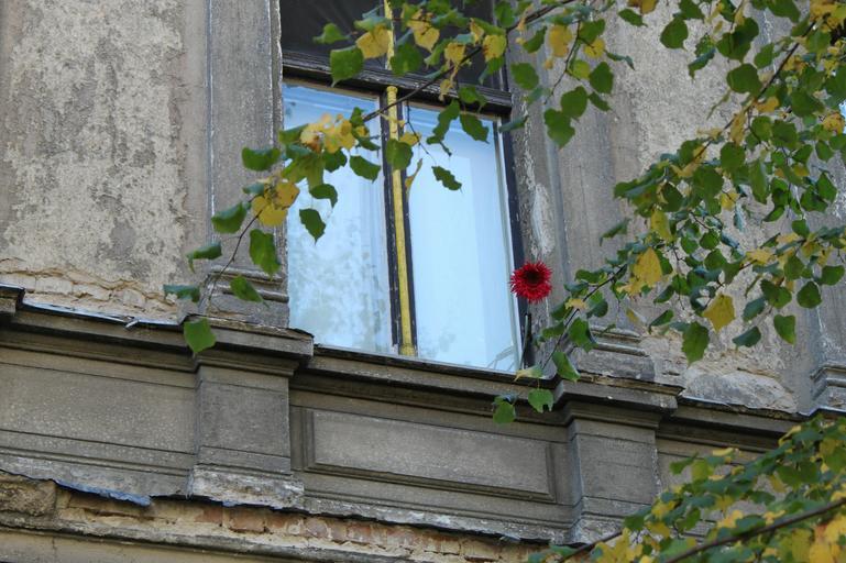 Keywords: window old window home facade building architecture old ruined house atmosphere wild decay dilapidated lapsed old house still life window sill flower flower vase deciduous tree still berlin prenzlauerberg friable masonry break up injury broken run down hauswand |